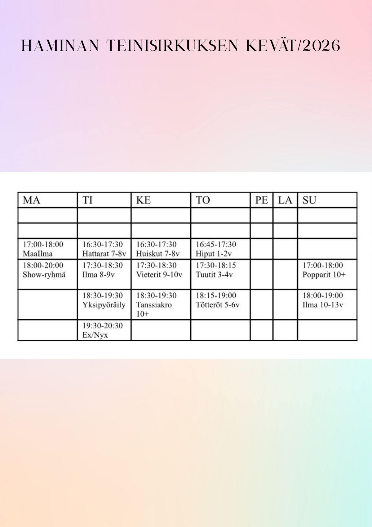 Sirkusharjoitukset pidetään Haminassa, Summan kylä- ja kulttuurikeskuksessa, osoitteessa Summantie 46. Tervetuloa!